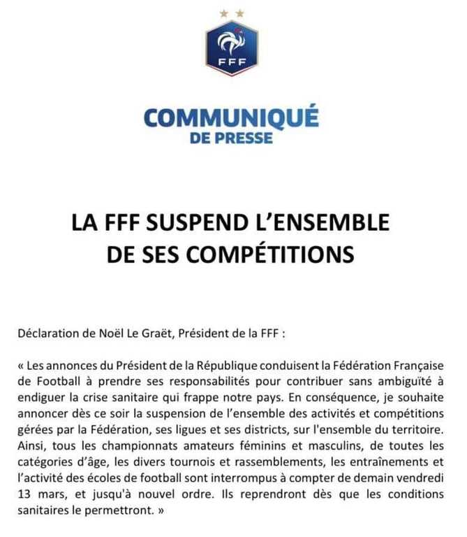 Suite au communiqué de la Fédération Française de Football, l'AS Plouvien suspend toutes les activités sportives à partir d'aujourd'hui 12h00.
